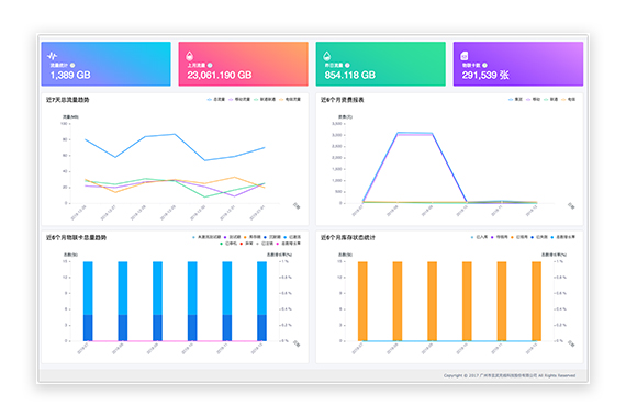 • 数据分析支持流量、资费、业务状态、定位信息等全方位多维度数据分析和展示,并可自动生成周报月报。