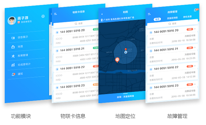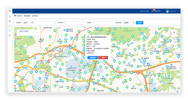 物联网卡需要在地图上展示出来,与远端移动终端进行业务绑定,支持按业务类型、管理区域等对卡进行筛选,并监测其运行状态。当物联网卡被未认证的终端使用,需发出告警信息或进行远程管理